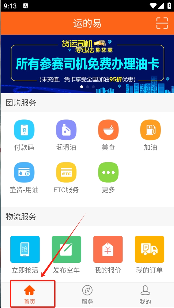 1、首先,打开应用并点击首页,查看可用的团购服务和物流服务。