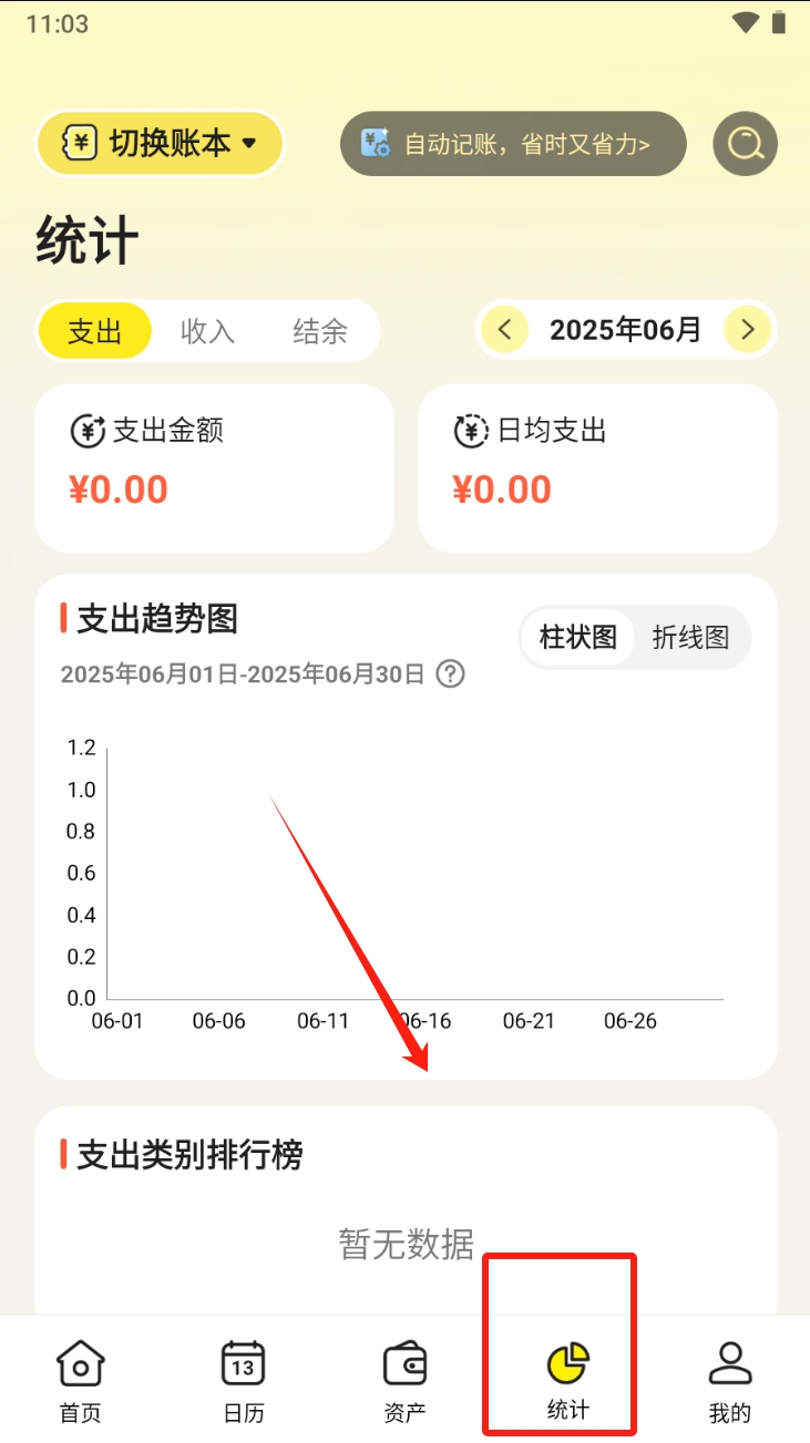 1、点击“统计”图标查看月度支出趋势图和支出类别排行。