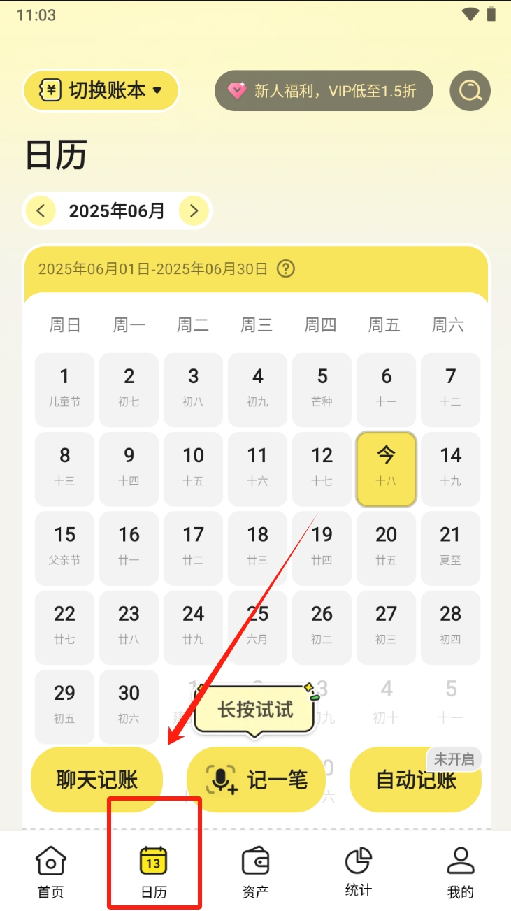 2、点击“日历”图标查看和记录特定日期的收支情况。
