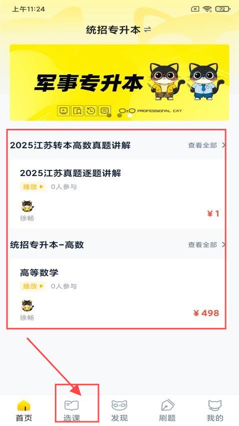1、进入应用,主页有推荐课程,也可以点击【选课】。