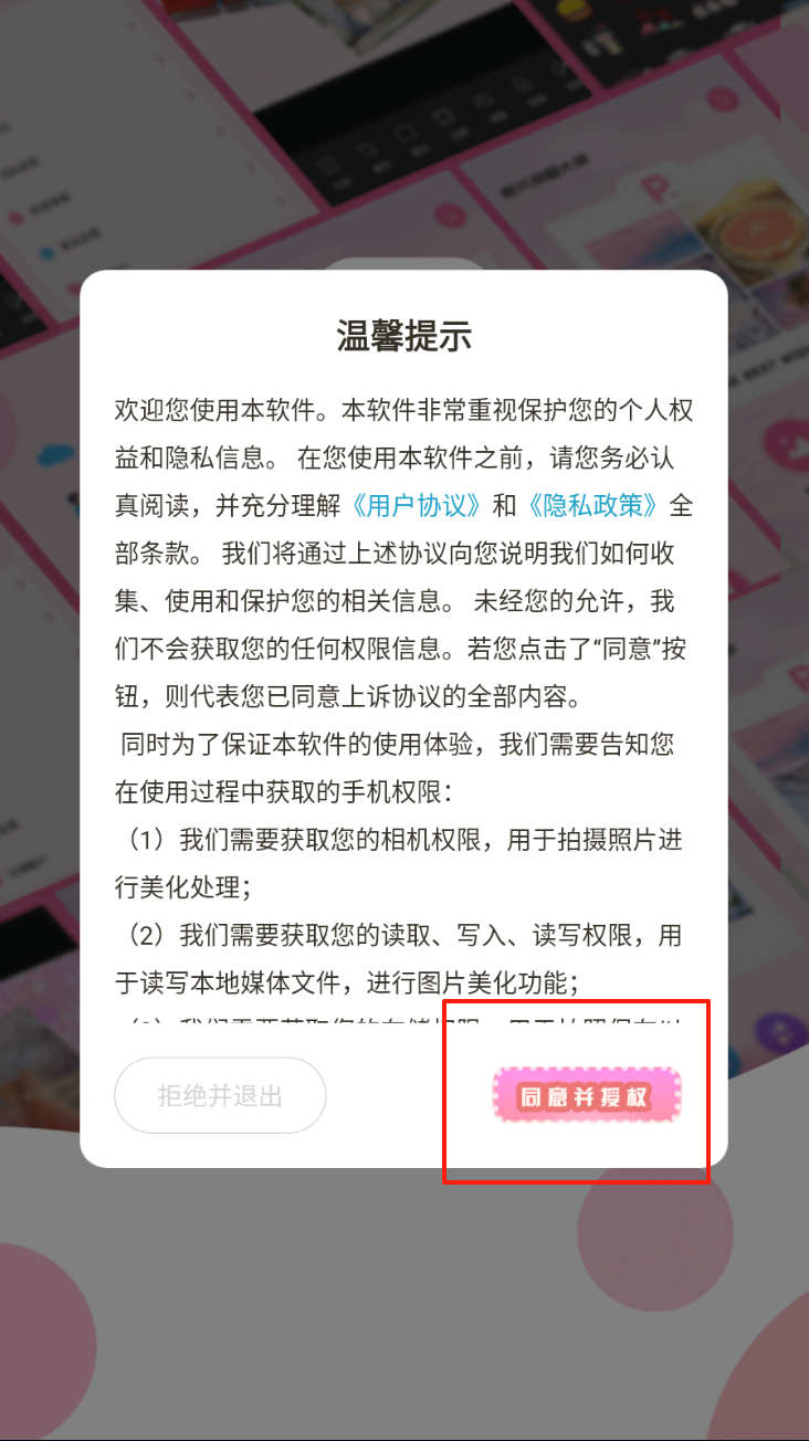 1、同意应用的隐私政策和用户协议。点击“同意并授权”继续使用应用。
