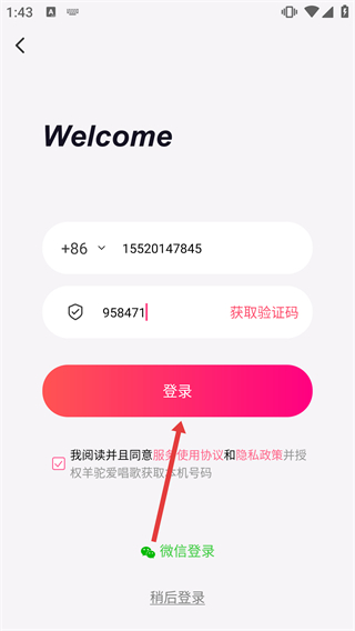 4、在登录页面填好【手机号】与【验证码】,勾选相关协议后,点击【登录】按钮即可完成账号登录流程。