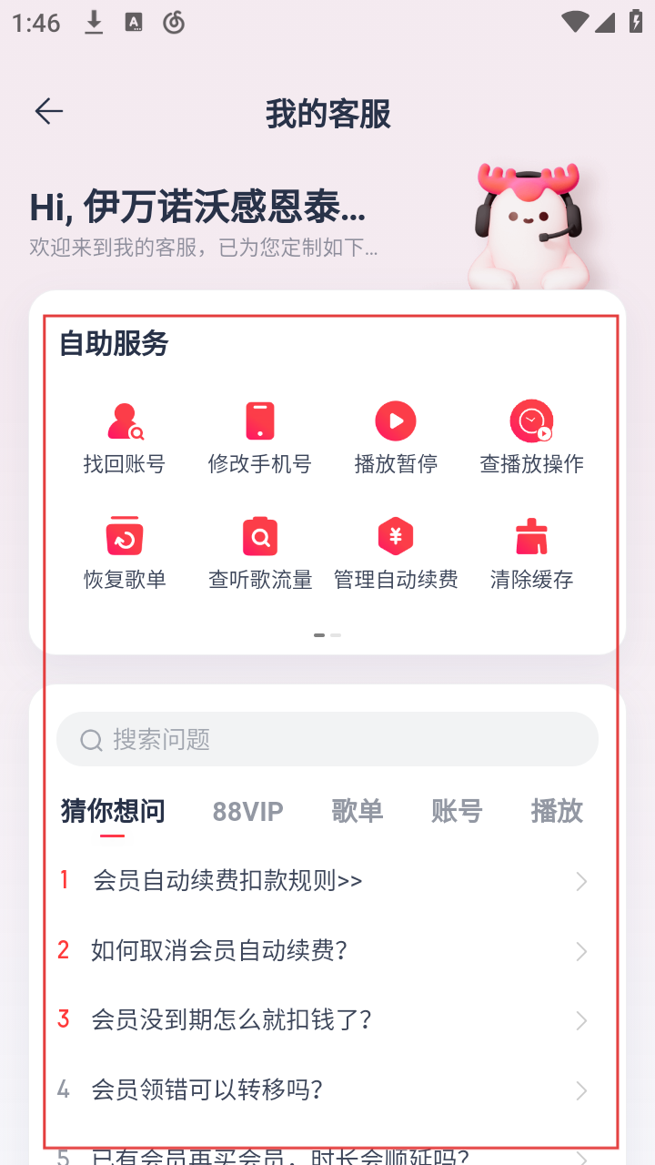 3、在“我的客服”页面,有自助服务和“猜你想问”等板块,可查找相关问题解答。