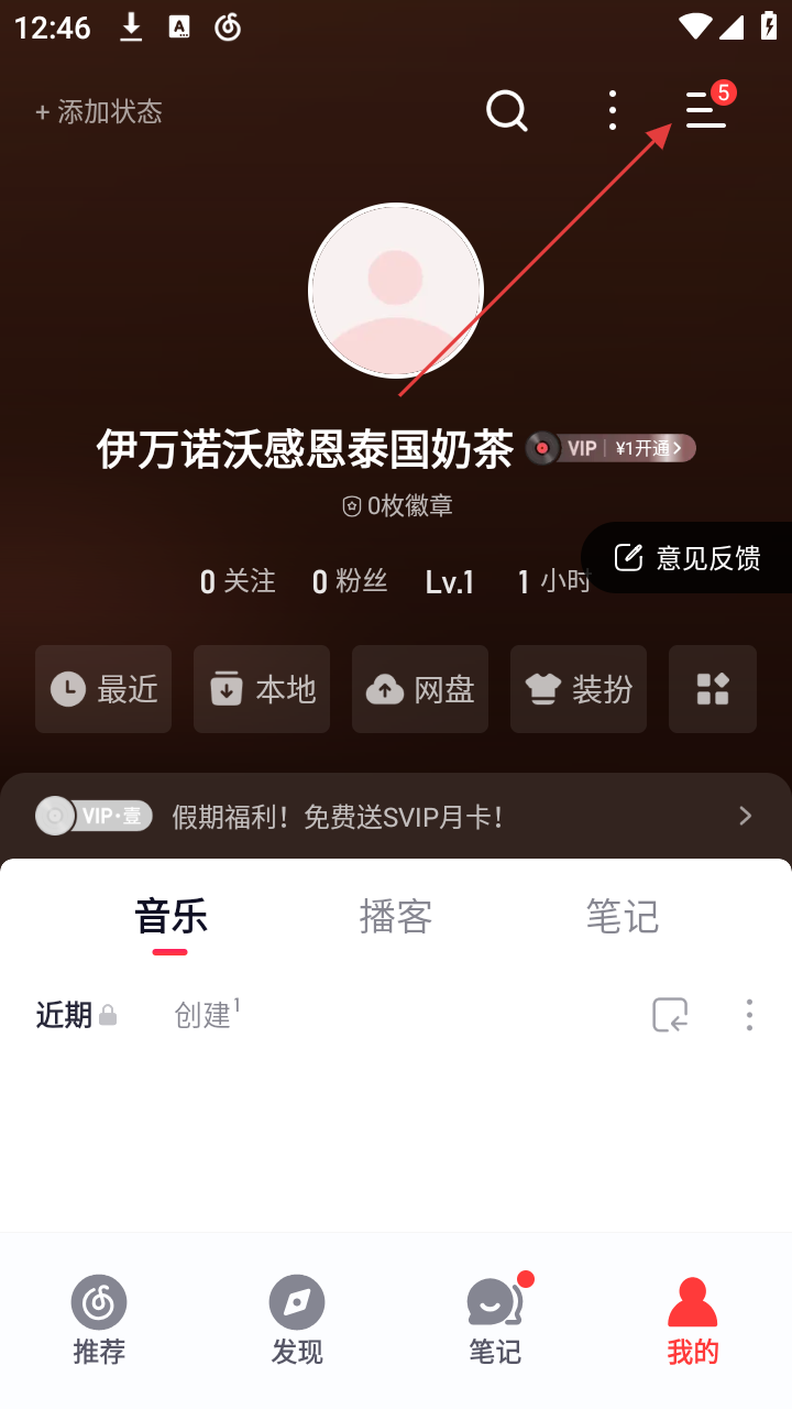 1、在网易云音乐“我的”页面,能看到用户信息等,点击右上角菜单图标,展开更多操作选项。