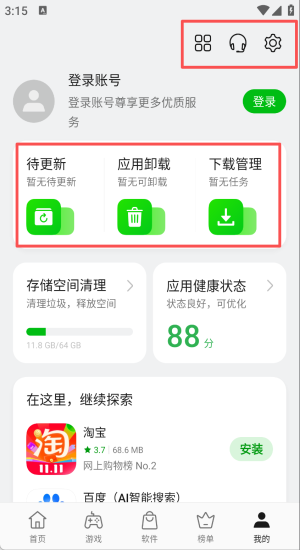 4、到我的页面登录账号,用存储清理释放11GB垃圾再装淘宝。