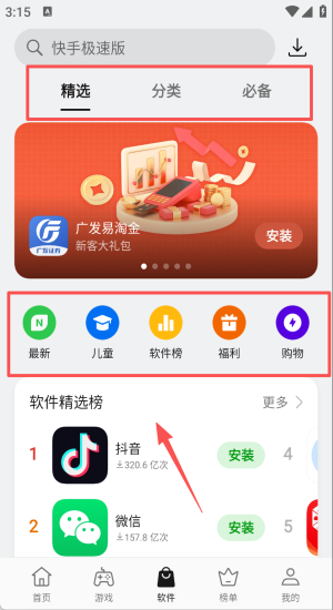 2、切到软件精选榜,把抖音微信一键批量装好秒开社交。