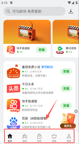 1、在首页搜索河马剧场,点安装先免费追剧再刷快手极速版。