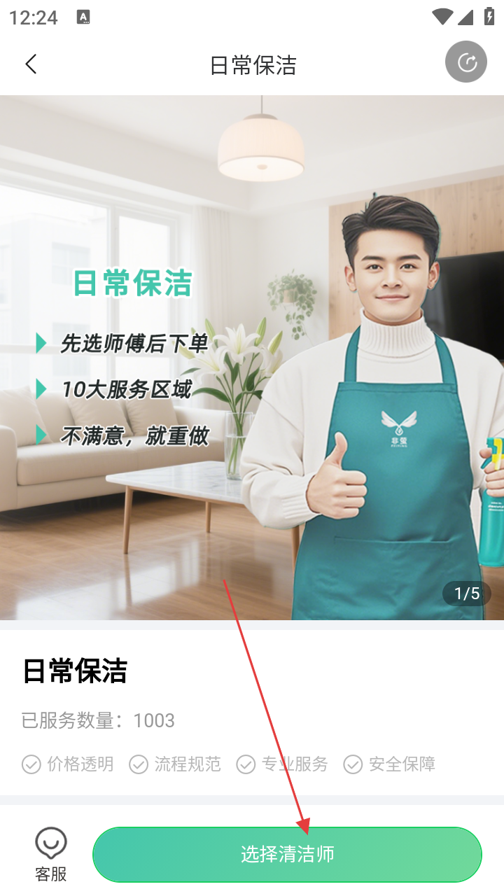2、进入日常保洁页,点击【选择清洁师】,跳转地址管理。