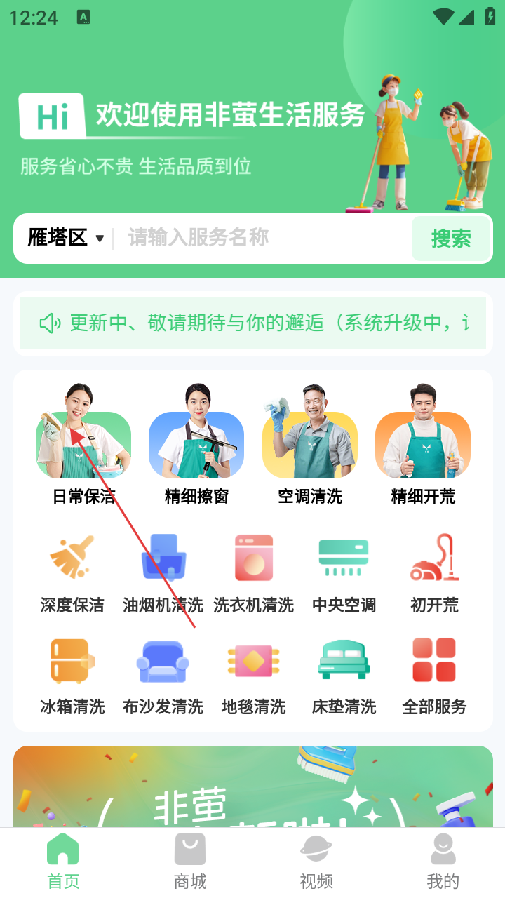 1、打开“非萤生活服务”,在首页选【日常保洁】服务。