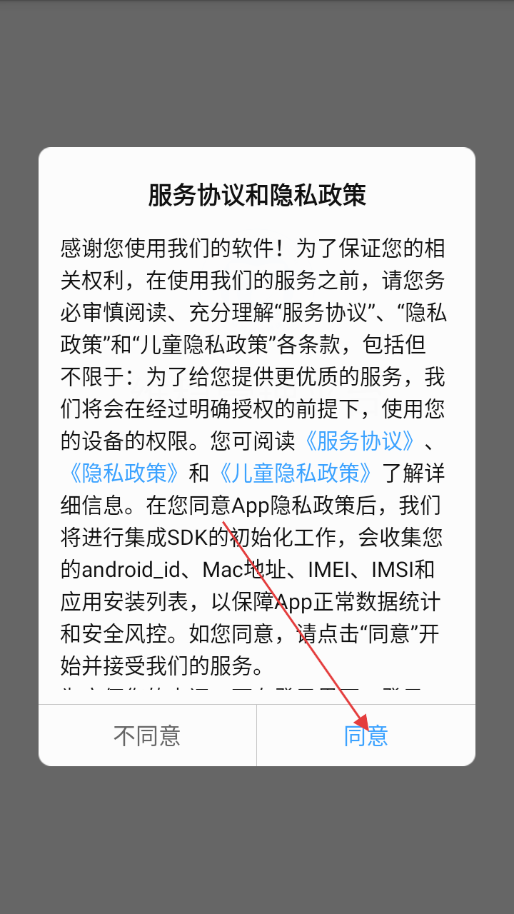 1、首次打开应用,阅读【服务协议和隐私政策】后点【同意】,进入下一步。