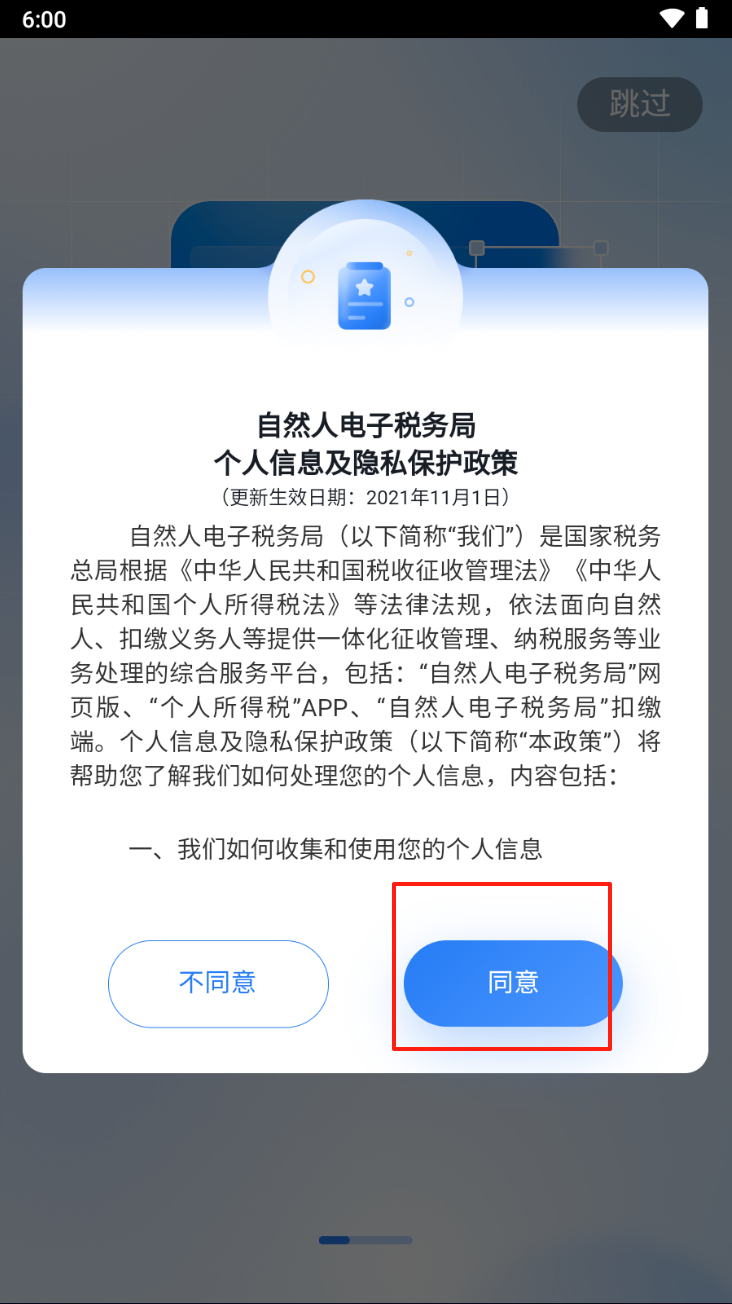 1、同意隐私保护政策。阅读并点击“同意”按钮,接受隐私保护政策。