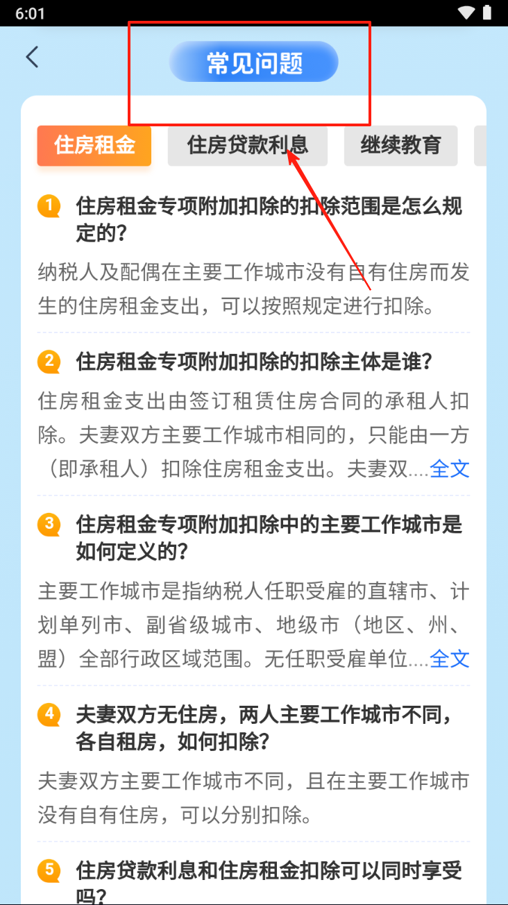 4、查询专项附加扣除相关问题。在“常见问题”页面,点击“住房贷款利息”查看相关问题解答。