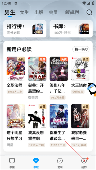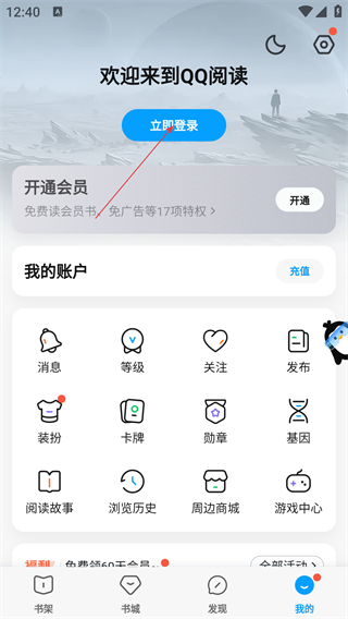 1、进入【QQ阅读】后,点击右下角【我的】,进入个人中心页。