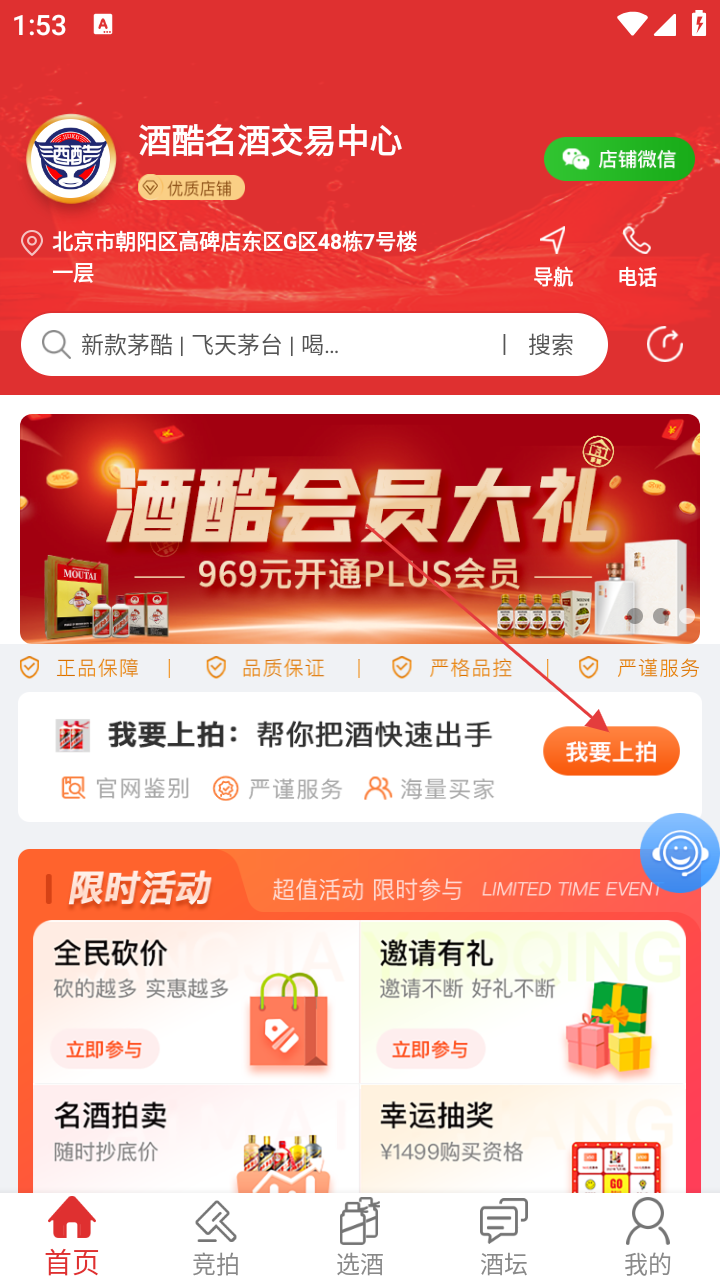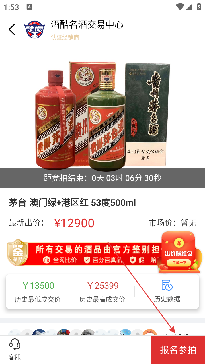 4、进入商品详情页,点击右下角【报名参拍】,即可参与名酒竞拍。