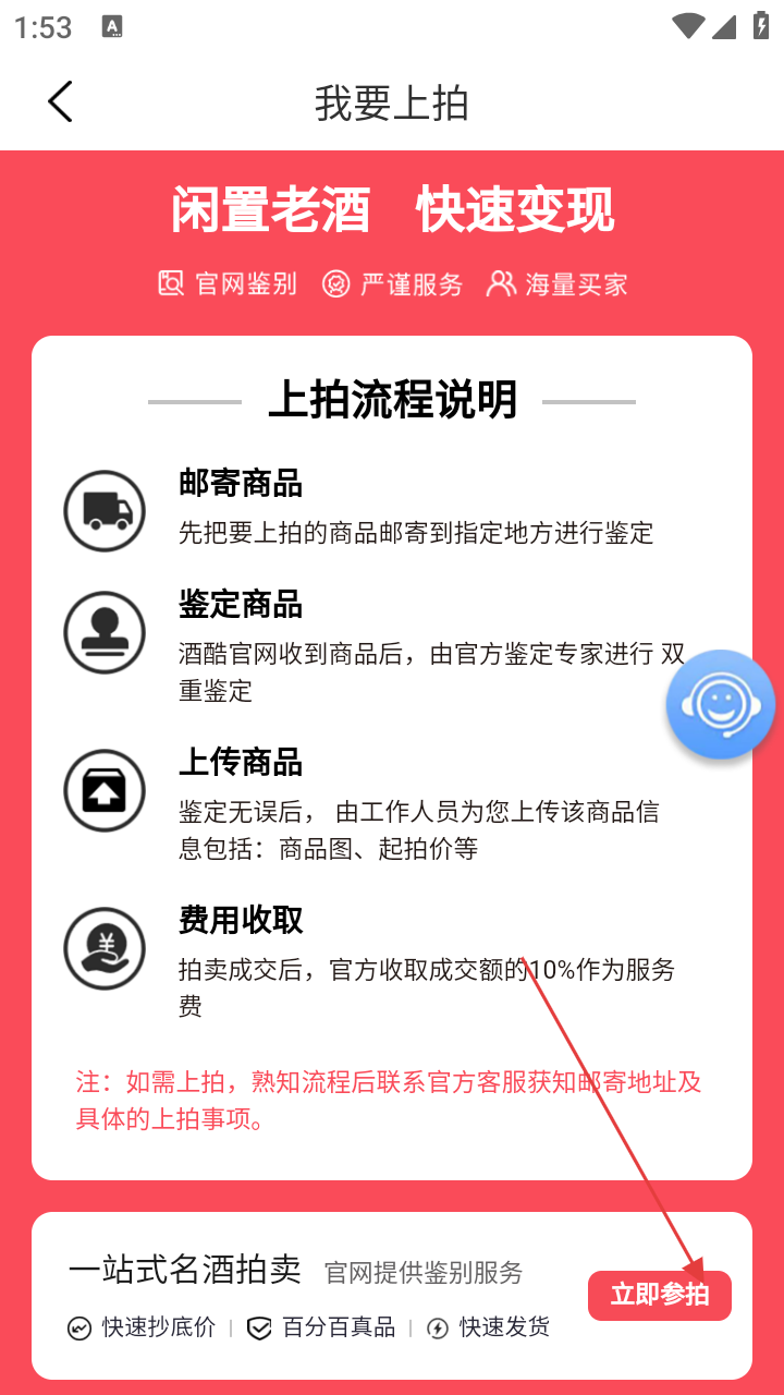 2、进入上拍流程页,点击【立即参拍】,进入竞拍专区。