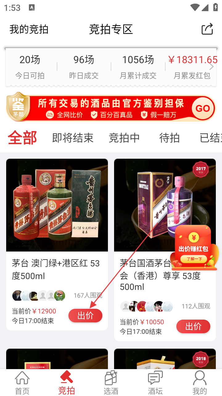 3、进入竞拍专区页面,选择想参拍的名酒,点击【出价】。