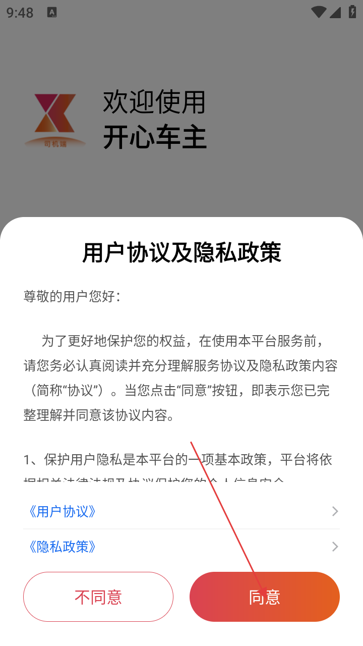 1、使用【开心车主】前,需点击【同意】【用户协议及隐私政策】,确认服务规则。