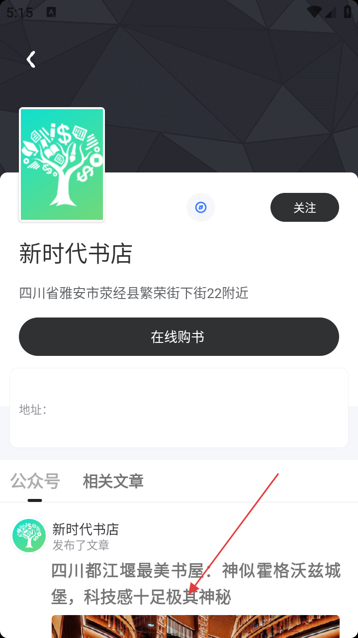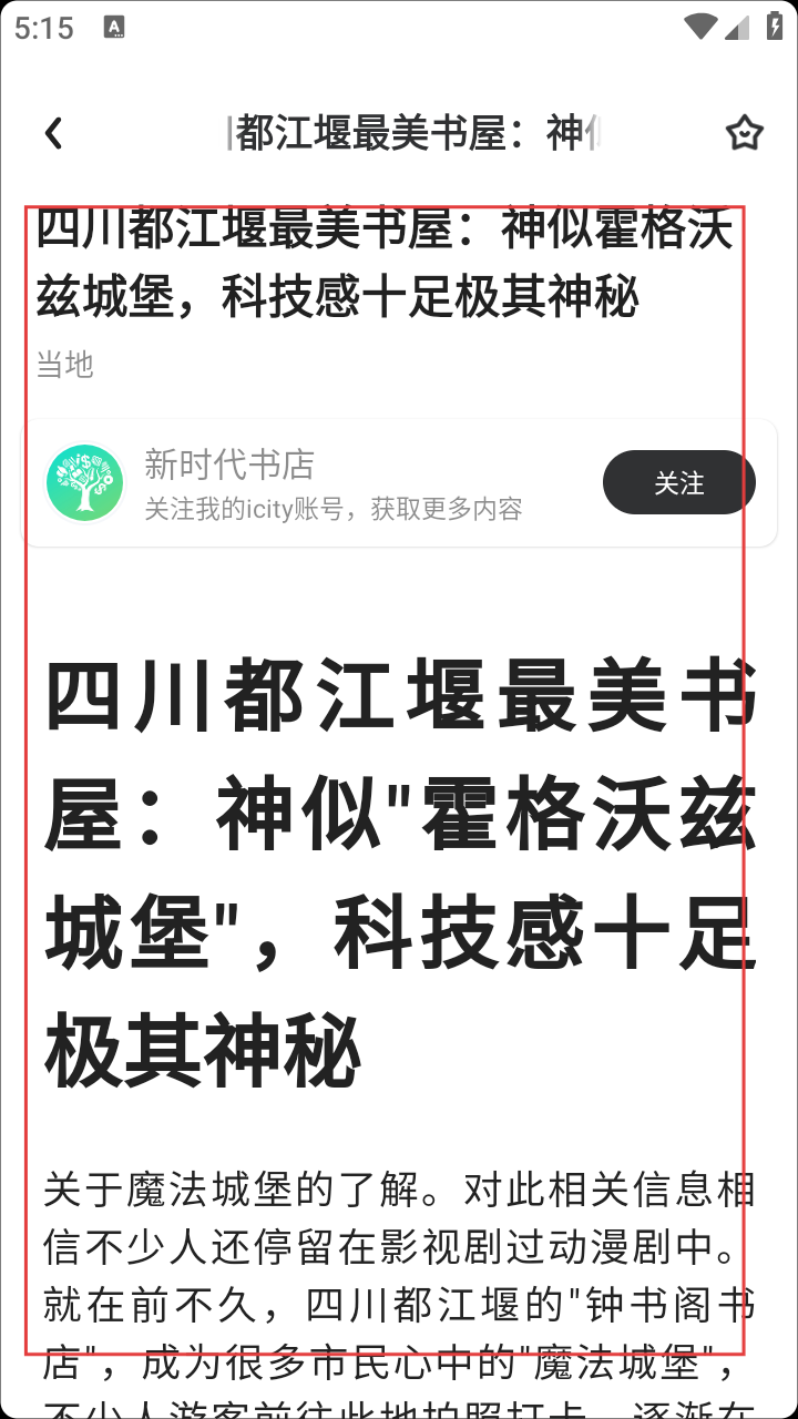 3、在新时代书店页面,点击文章《四川都江堰最美书屋:神似霍格沃兹城堡,科技感十足极其神秘》。