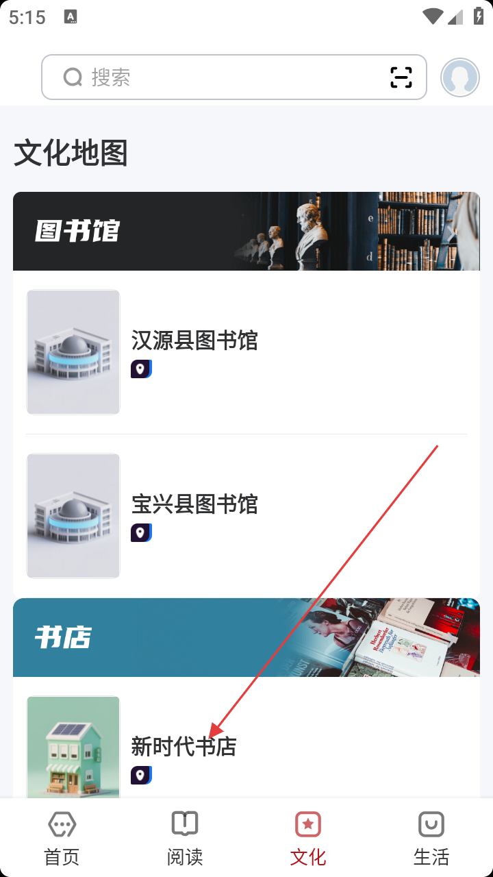 2、在文化页面,找到【新时代书店】并点击,进入书店相关界面。