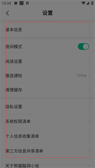 2、在【我的】页面,点击【设置】,可进入设置界面,进行夜间模式等设置操作。