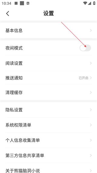 3、在设置页面,找到【夜间模式】选项,点击其开关按钮。