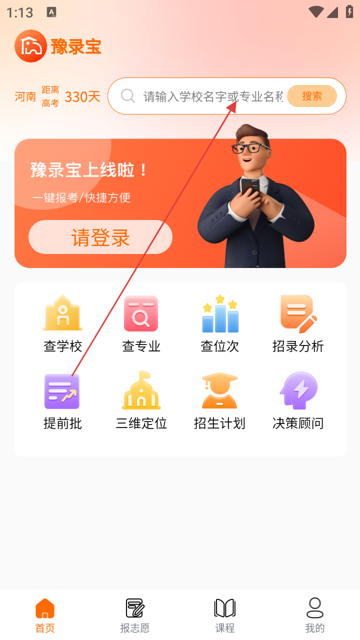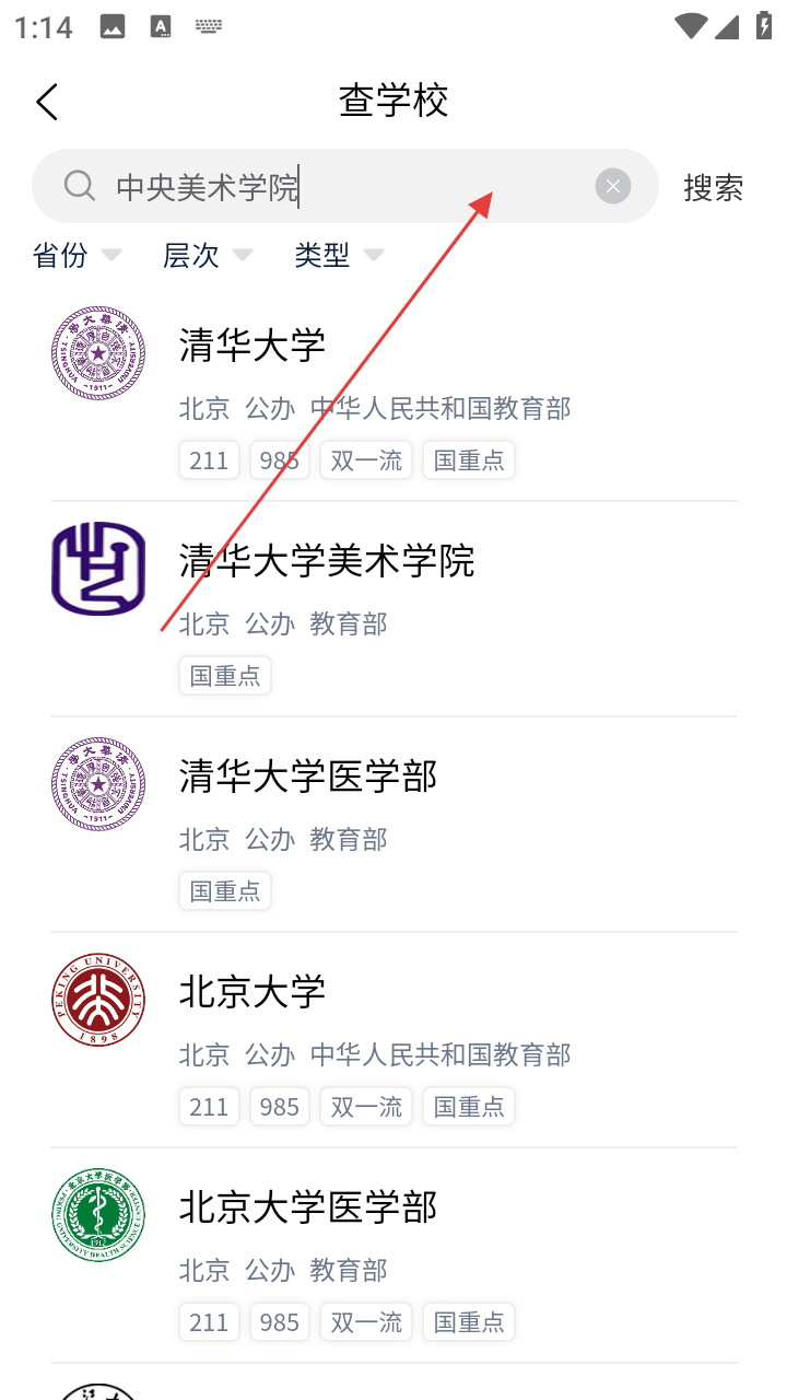 2、进入查学校页面,在搜索框输入校名。