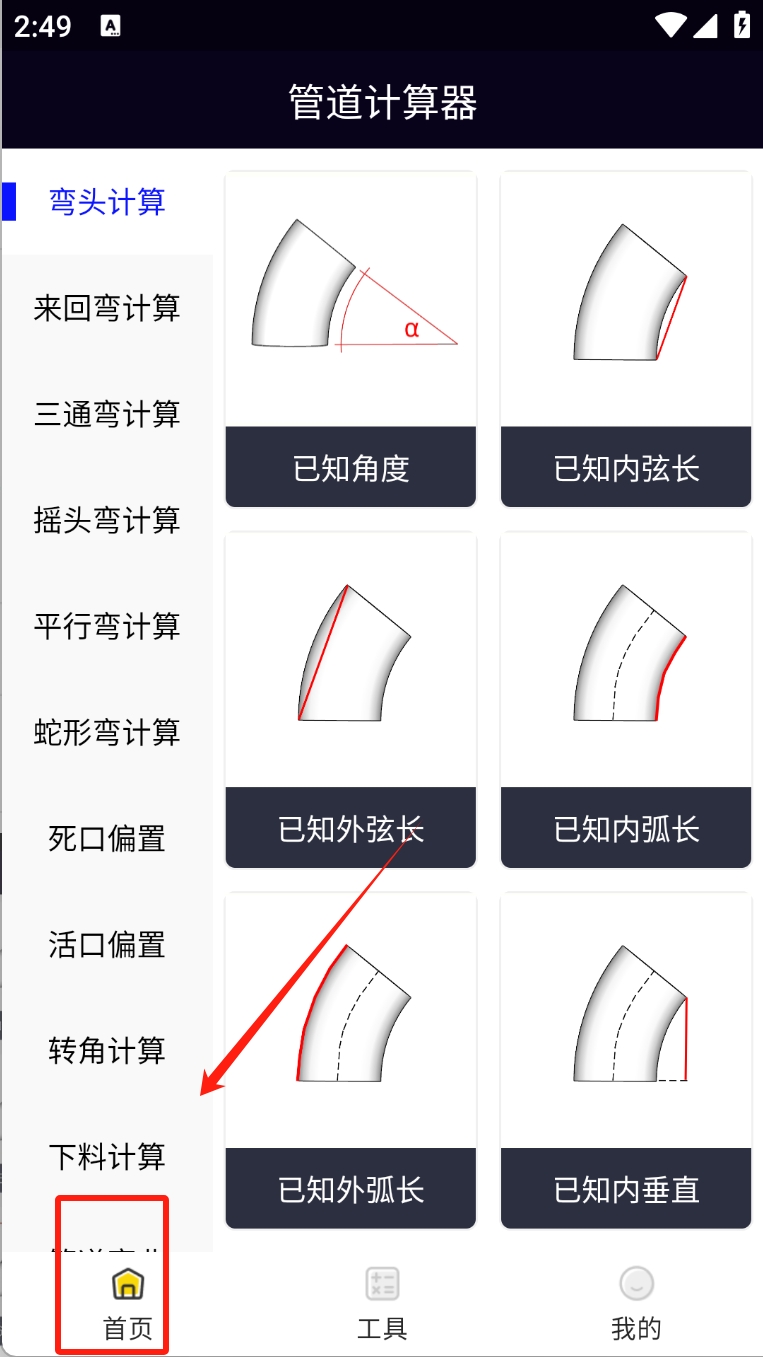2、选择需要的计算功能。点击“弯头计算”或其他选项。