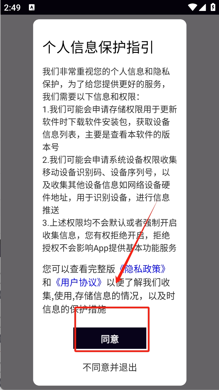 1、阅读个人信息保护指引。点击“同意”以继续使用应用。