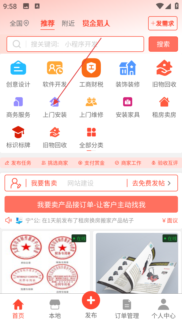 1、打开软件首页,点【上门安装】分类,进入服务列表。