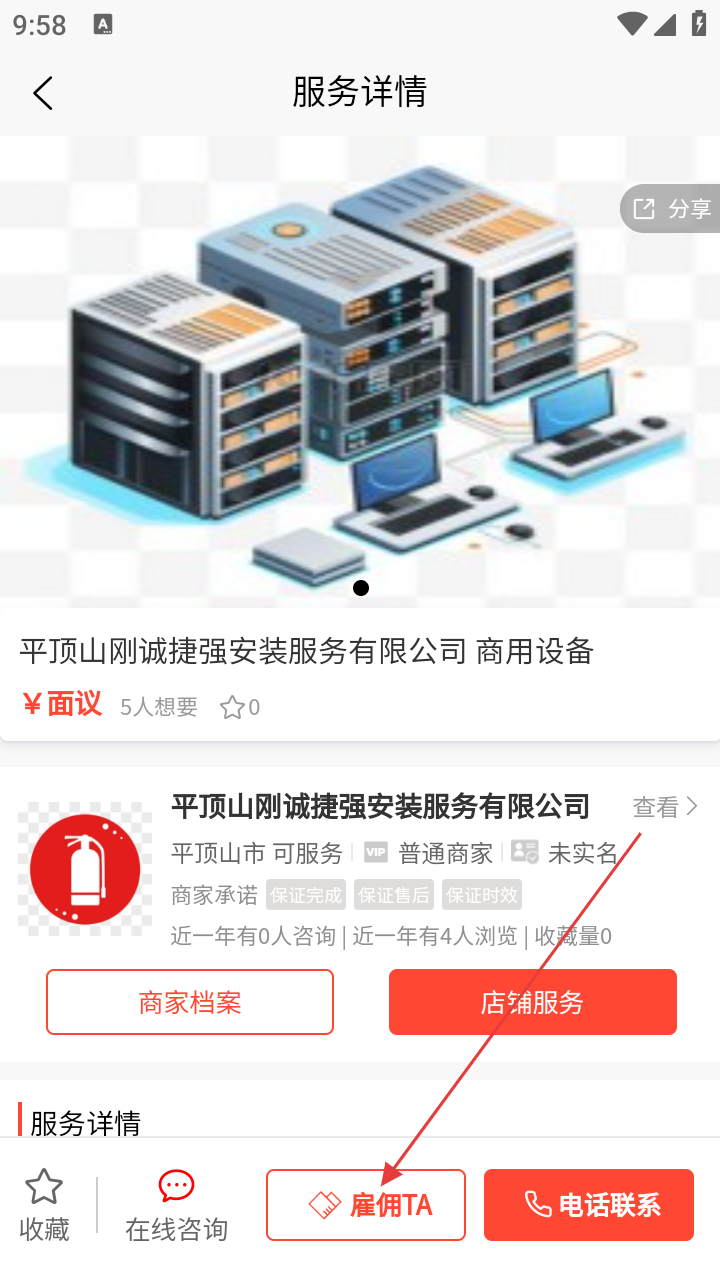 3、进入服务详情页,确认信息后,点击【雇佣TA】发起需求。