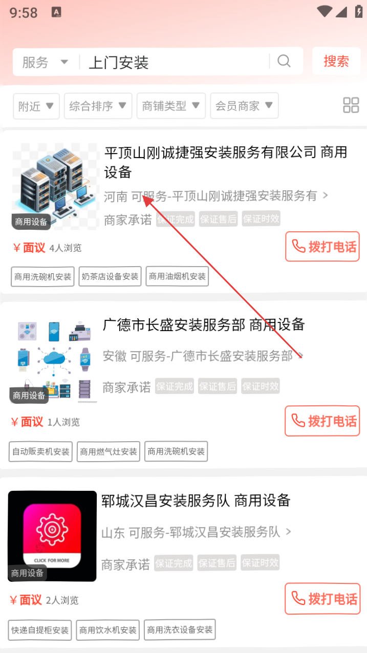2、在【上门安装】列表,选“平顶山刚诚捷强安装服务有限公司-商用设备”商家。