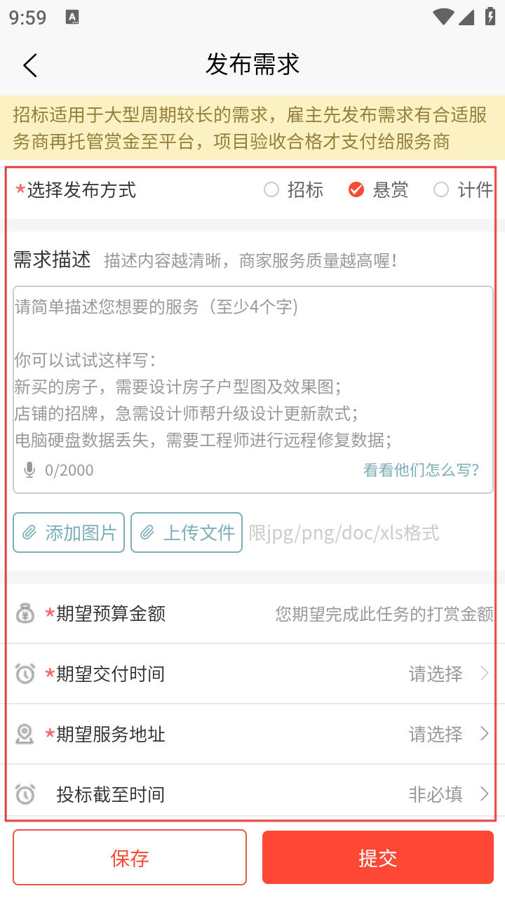 4、在发布需求页,填发布方式、需求描述等信息,点【提交】发布。