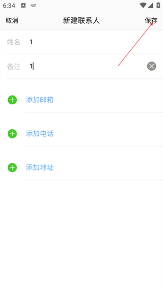 4、在【新建联系人】界面填写好信息后,点击右上角【保存】,即可完成联系人创建。