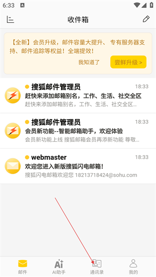 1、在搜狐邮箱【收件箱】界面,点击底部【通讯录】选项,可进入通讯录功能页面。