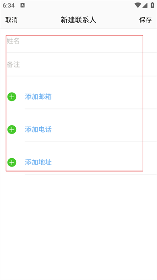 3、新建联系人时,需填写【姓名】【备注】,还可添加【邮箱】【电话】【地址】等信息。