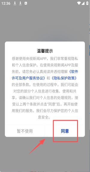 1、启动APP后,点击“同意”按钮以接受软件许可及用户服务协议。
