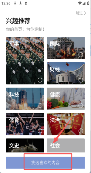 2、在兴趣推荐页面,点击“挑选喜欢的内容”以定制您的首页内容。