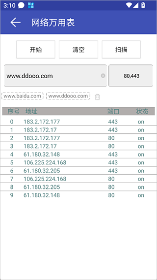 3、端口扫描功能,默认扫描常用端口(如80、443、22等),支持自定义范围,辅助排查服务可用性。