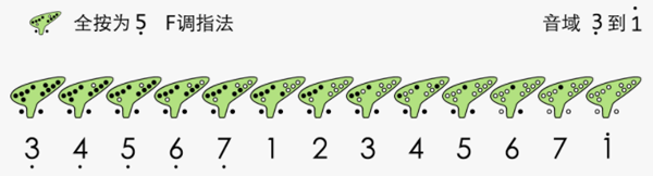 六孔陶笛采用不同指法可以吹出音域不同音阶。下面的图片是指孔全按住为低音5的指法,可以吹出低音5到中音7的音阶。另外如果配合一定的技巧,还可以吹出高音1。因为一般的歌谱的音域正好在这个范围内,所以这个指法最常用。C调陶笛用该指法吹出来的是F调。