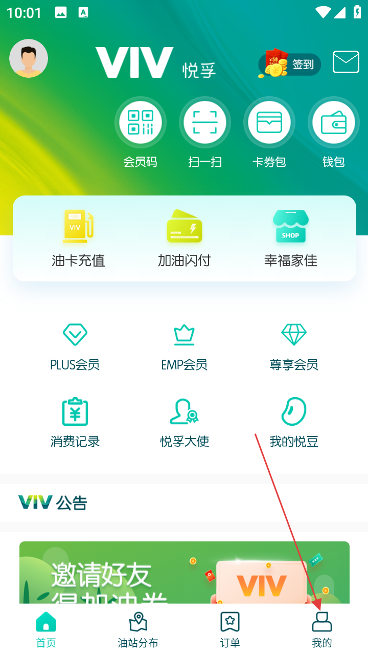 1、打开悦孚加油,进入后可点击底部【我的】,查看会员码、卡券包等功能。