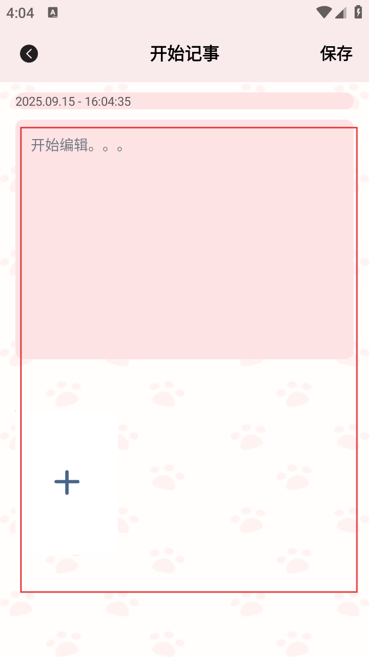 2、进入【开始记事】页面,在编辑区域输入内容,也可点击下方“+”号添加图片。