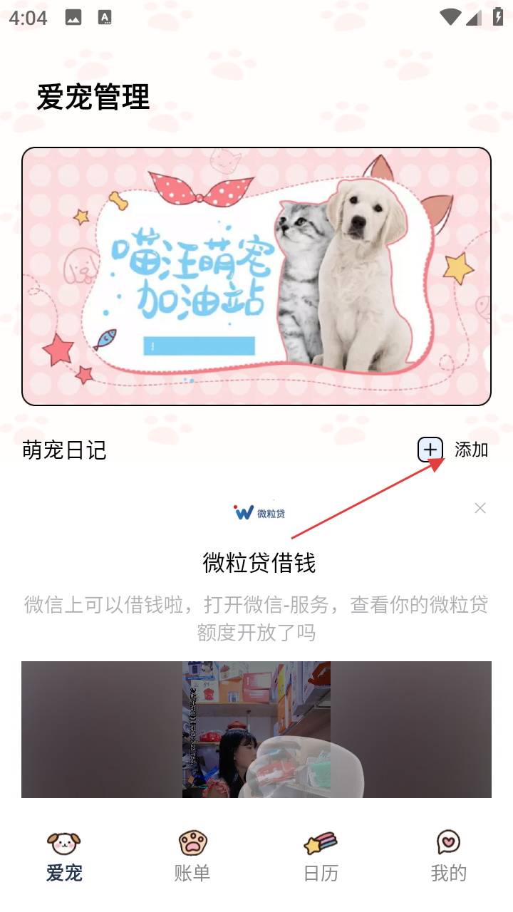 1、进入【爱宠管理】页面,点击【萌宠日记】右侧的“添加”按钮。