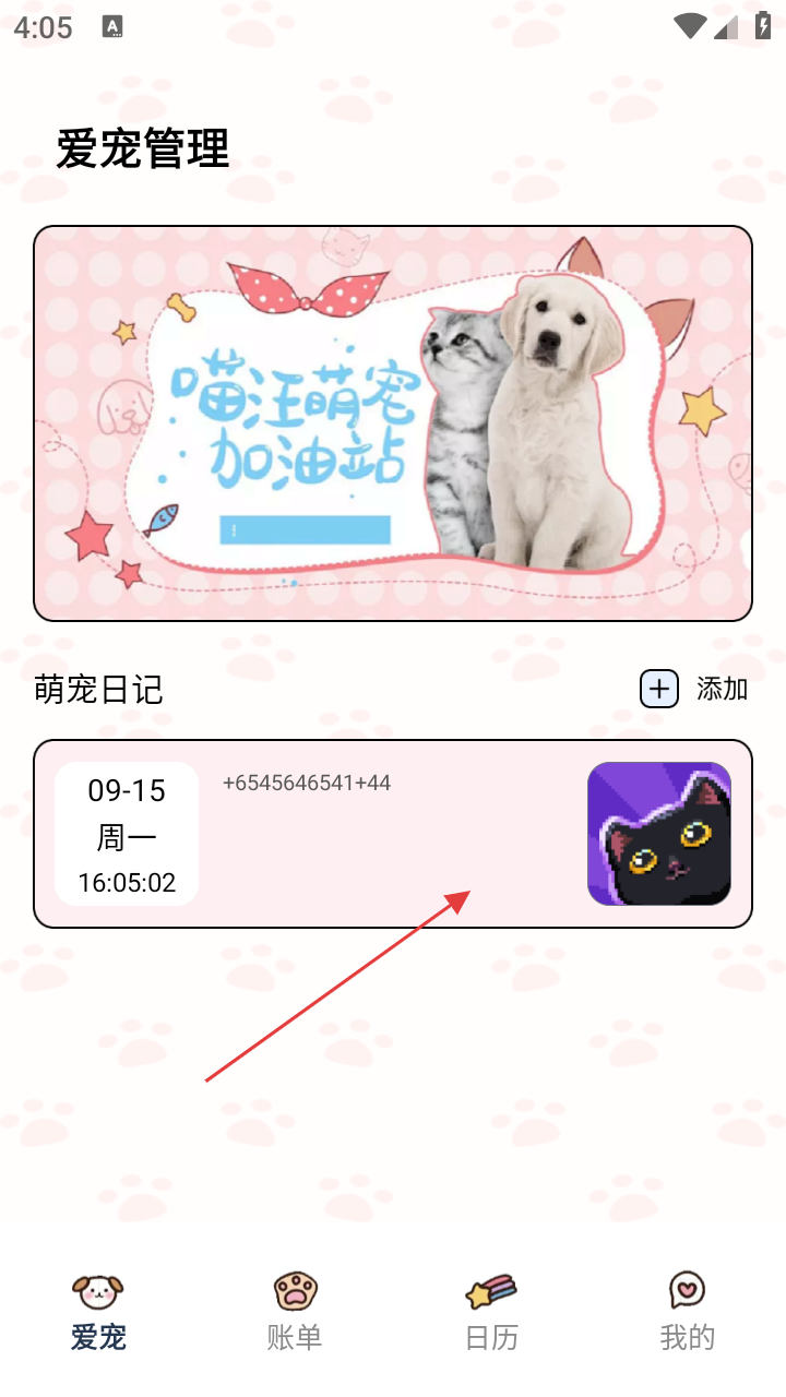 4、保存成功后,返回【爱宠管理】页面,即可在【萌宠日记】区域看到刚记录的内容。