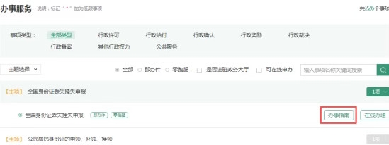 2、下划界面至办事服务,展开“全国身份证丢失挂失申报”事项,点击“办事指南”。