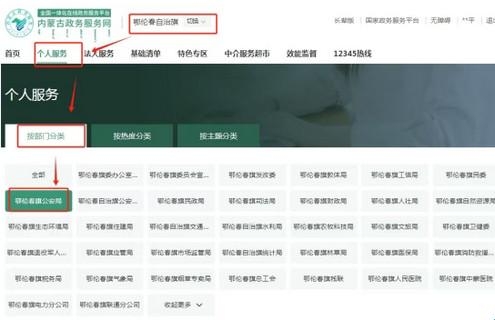 1、使用“蒙速办”APP扫描二维码登录内蒙古政务服务网,将区划改为“鄂伦春自治旗”,之后点击“个人服务”,选择“按部门分类”,选择“鄂伦春旗公安局”。