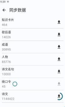 由于诗文数据超过110万,数据量较大,解压后需要分批次导入(为了解决及避免导入时手机内存分配出错的问题),每次在右侧的进度条停止后,再选择下一组数据导入,建议选择空闲时段进行同步。