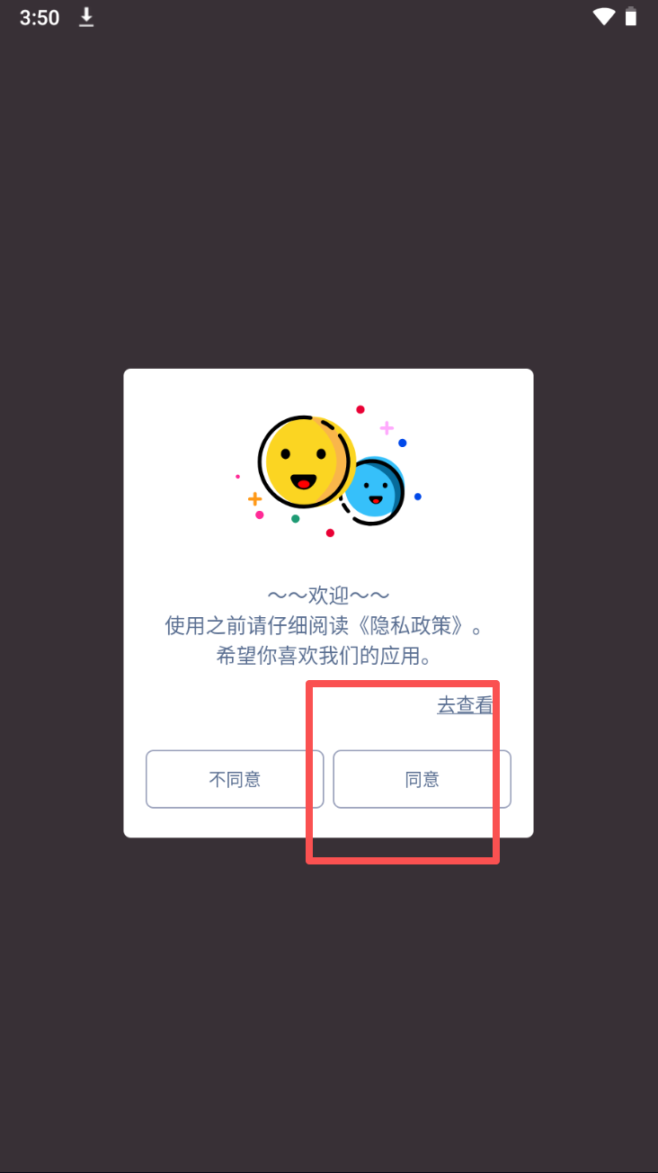 1、在欢迎弹窗里,点击 “同意” 按钮,进入 APP 主界面。