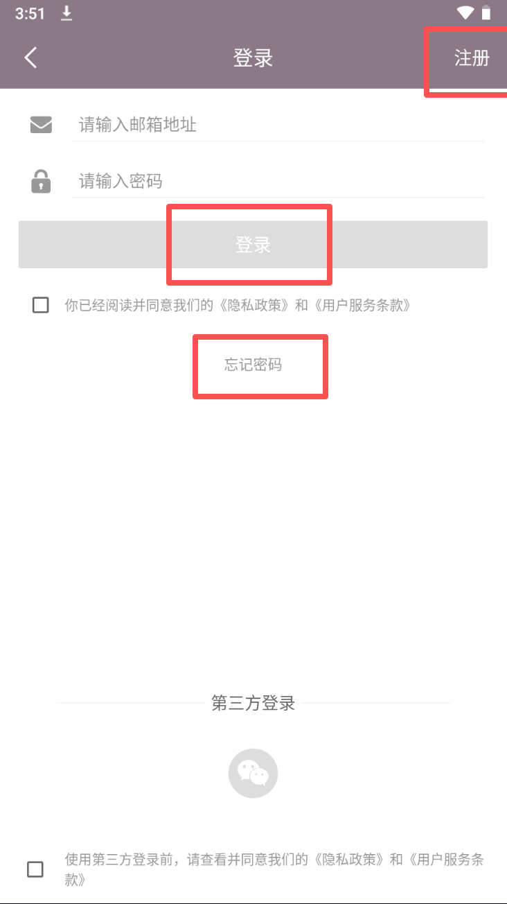 4、在登录页面,可选择登录、注册或找回密码等操作。