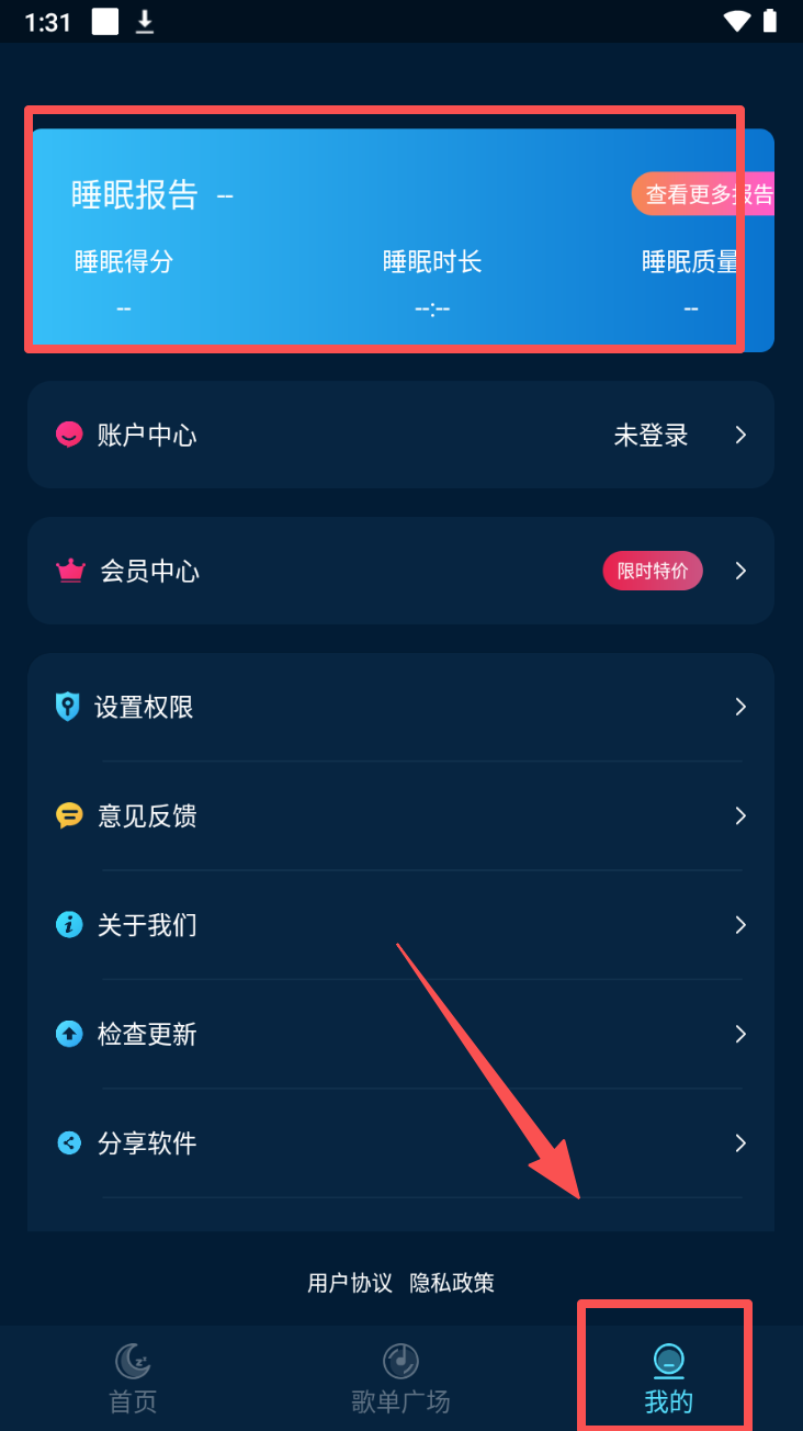4、在“我的”页面,查看睡眠报告和其他个人信息。