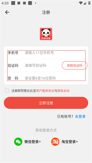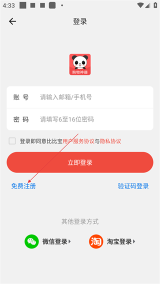 3、在登录界面,可选择账号密码登录,也可点击【免费注册】进入注册页面,还支持微信、淘宝等第三方登录方式。
